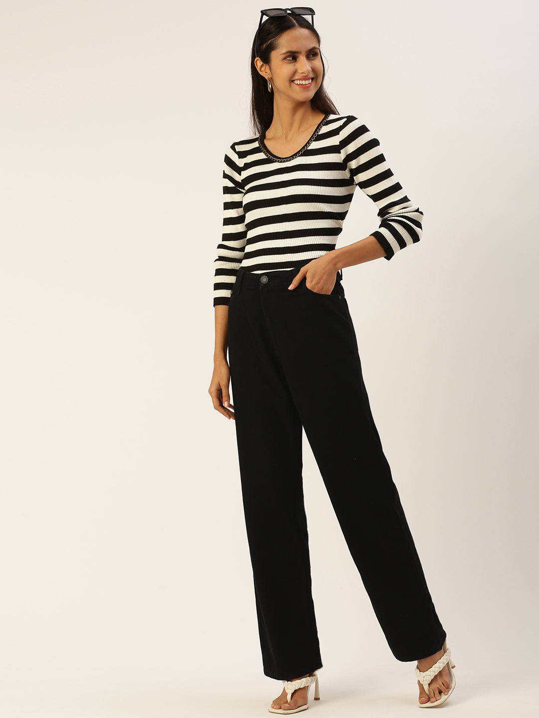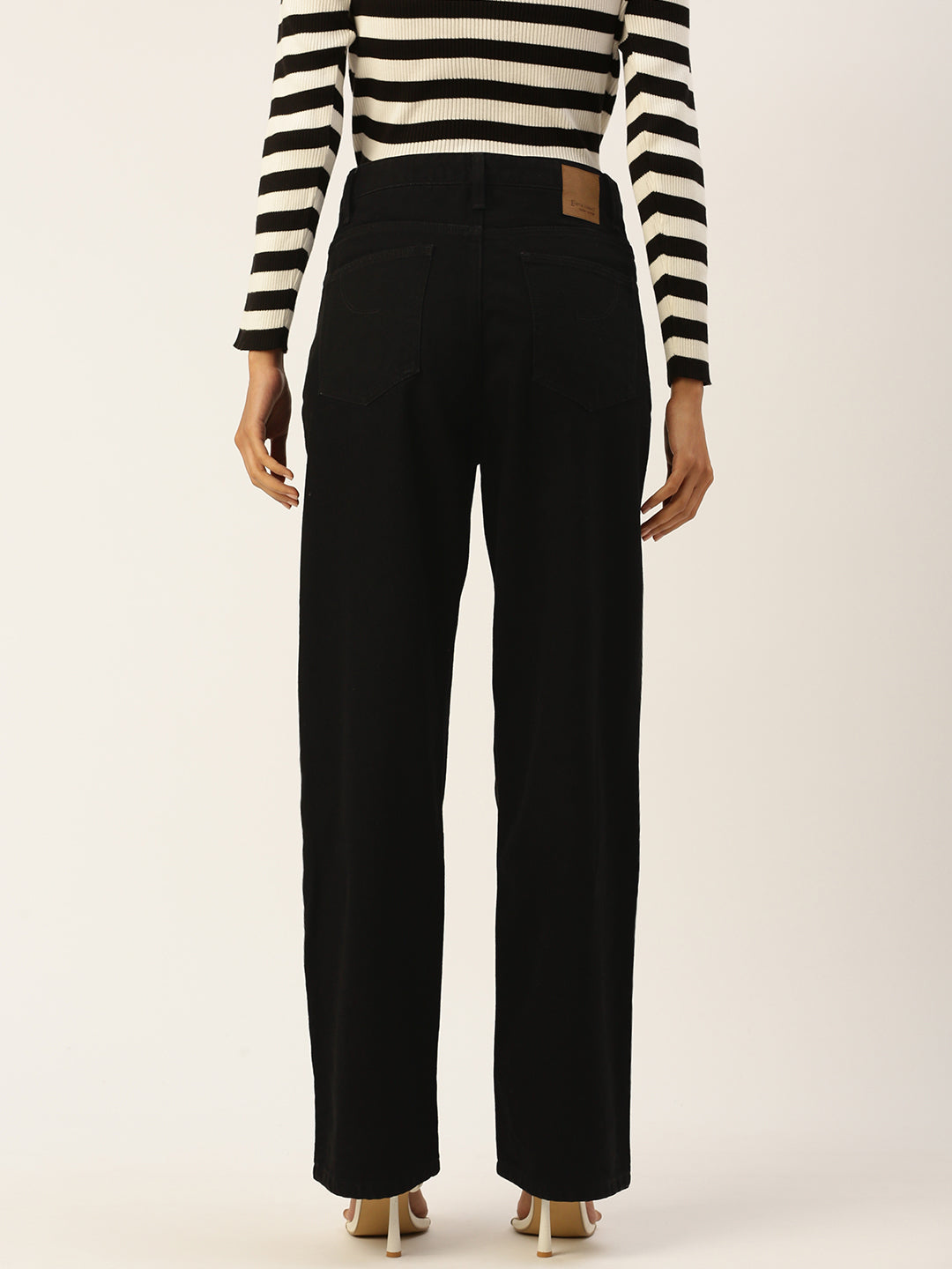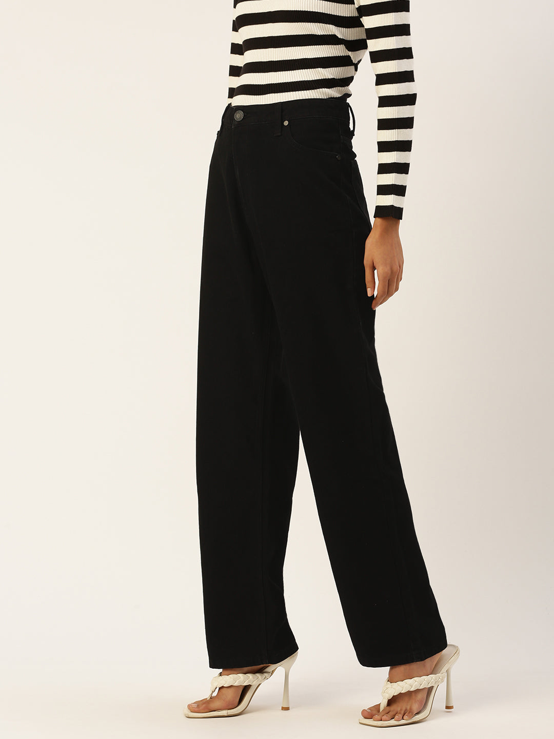 The Women’s Black High-Rise Straight Fit Solid Jeans offer a timeless and flattering look with a modern twist. Designed with a straight fit, these jeans provide a comfortable yet structured silhouette that is both flattering and versatile. The regular length ensures they can be easily paired with a variety of tops and shoes for a classic casual look. The high-rise waist offers a secure, comfortable fit and enhances your natural shape, while the button-and-loop waist closure allows for an adjustable, custom fit. The solid black pattern provides a sleek, sophisticated style, perfect for any casual occasion. The button-and-zip closure ensures practicality and ease of wear.