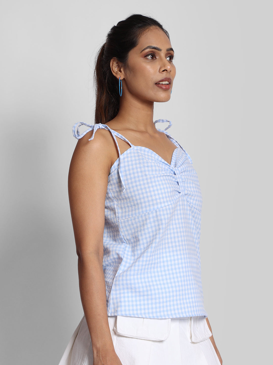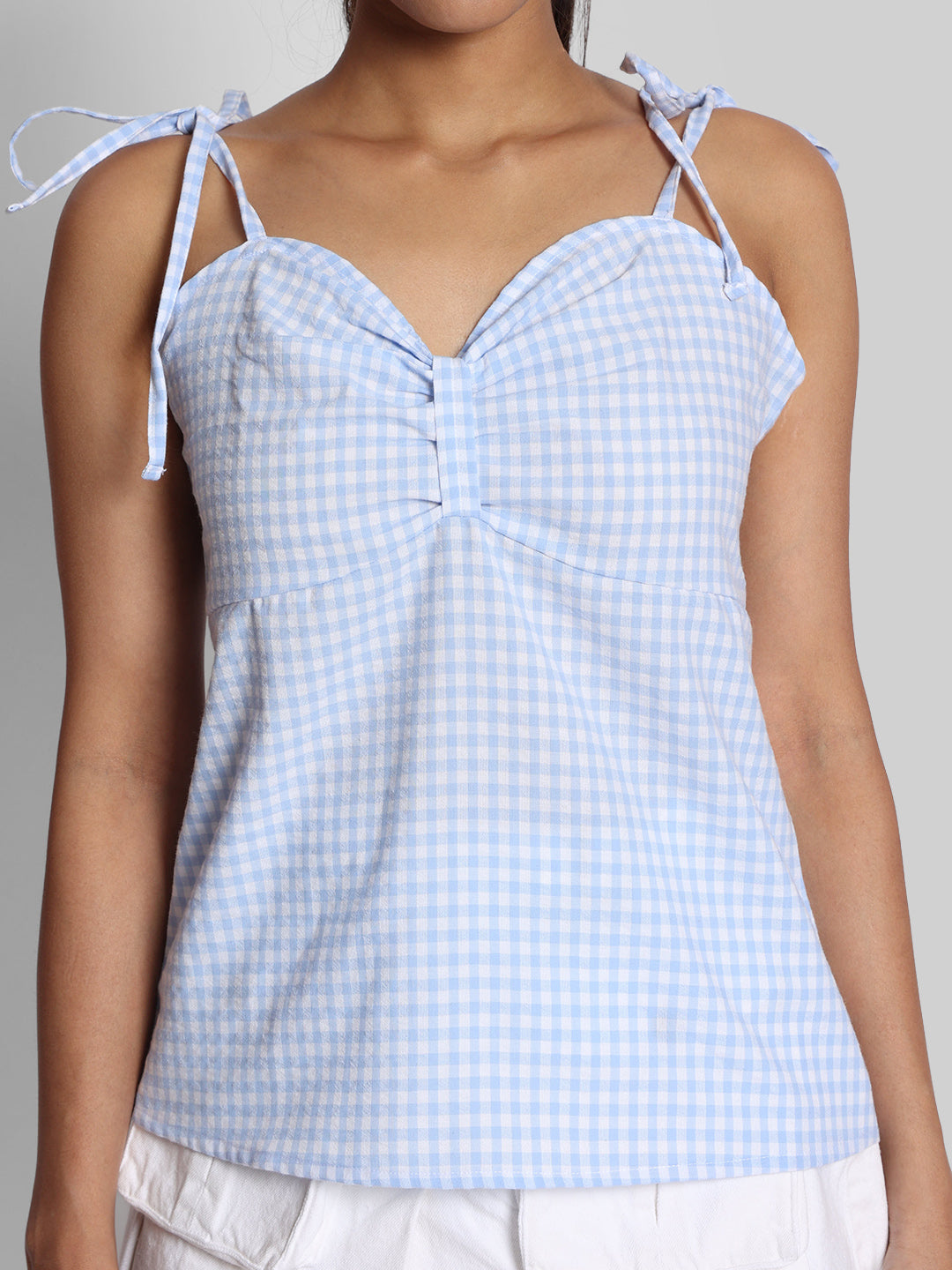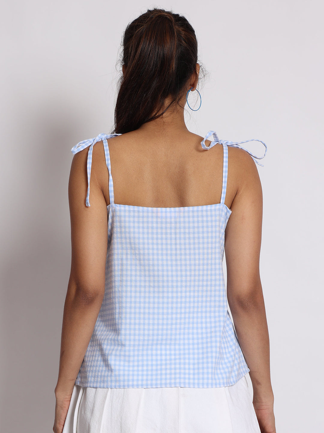 Women Blue Spaghetti Tie Up Bow Checkered Top